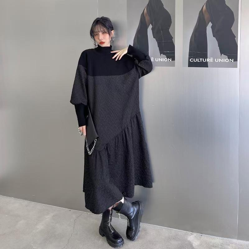初春夏 ワンピース 日韓ファッション 揺れるトレンド ワンピース 秋 ロングワンピース体型カバー 着痩せ 長袖 ハイネック Aラインワンピ シンプル 上品 大人30%制限